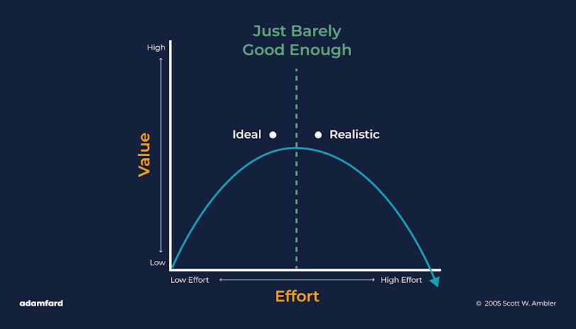 Interestingly, a principle that makes Agile product design efficient is called “Just Barely Good Enough.” The designs that teams deliver at the end of an iteration need to be somewhere between ideal and realistic. This reflects the very nature of this methodology.