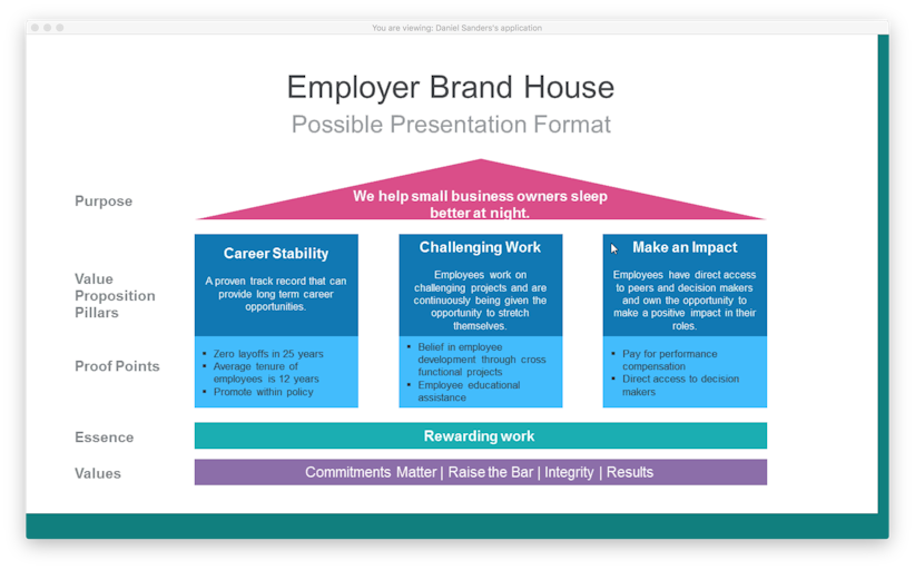 A great way to do that is an employer-brand house. You can follow the template below to create a meaningful representation of your company’s identity by outlining its core values.