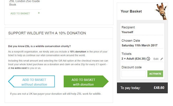 Okay, here’s another fairly unpleasant case. Take a careful look at the example below. ZSL London Zoo’s interface invites its users to add something to their baskets, but they can do so with or without adding a donation to their order.