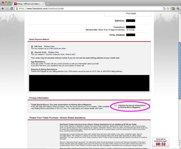Above is an example of the roach motel in the checkout process on the livenation.com website. When making a purchase on the entertainment company’s website, users will have to tick a box to NOT buy a Rolling Stone subscription. Yes, you have to do an extra action and read the fine print to not be sold something you don’t need. ¯\_(ツ)_/¯