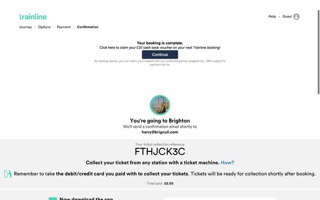Once you’re done purchasing the ticket, you’ll be taken to a confirmation page. If you look carefully, the screen is separated into two. The top half is a disguised ad. The copy tells you that your booking is good to go, but you could also sign up for a free voucher worth 20 GBP. Free money!