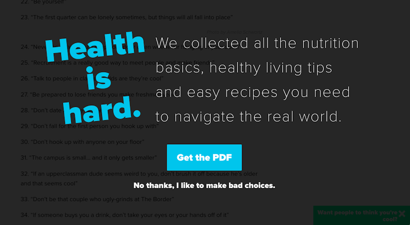 This pattern basically revolves around shaming the user into doing something. Typically, you’ll see a popup offering you something. You have the right to accept or decline the offer. However, the text behind the refusal will be worded in a way resembling this: