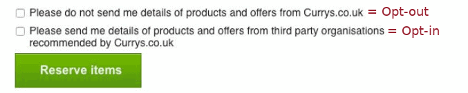 Here’s a great example of a trick question. Imagine you went to Curry’s website—they’re a major electrical supplier in the United Kingdom. As you move down the page, at the very bottom, you’ll see two boxes. The first one suggests you tick the box to opt out of their email list. The second one, on the contrary, will opt you into a third-party mailing list.