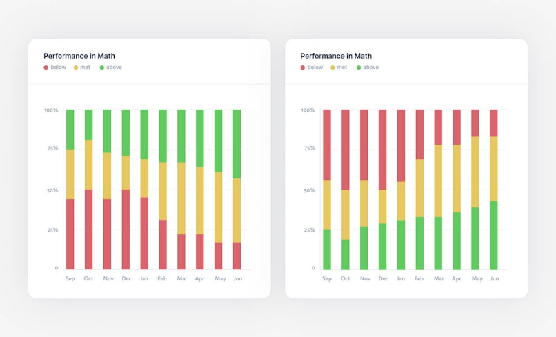 Below is an example of how we approached this issue. The graph on the left focuses on the students that performed on or above par. Whereas, the second one primarily informs the user about the students with sub-par performance first.