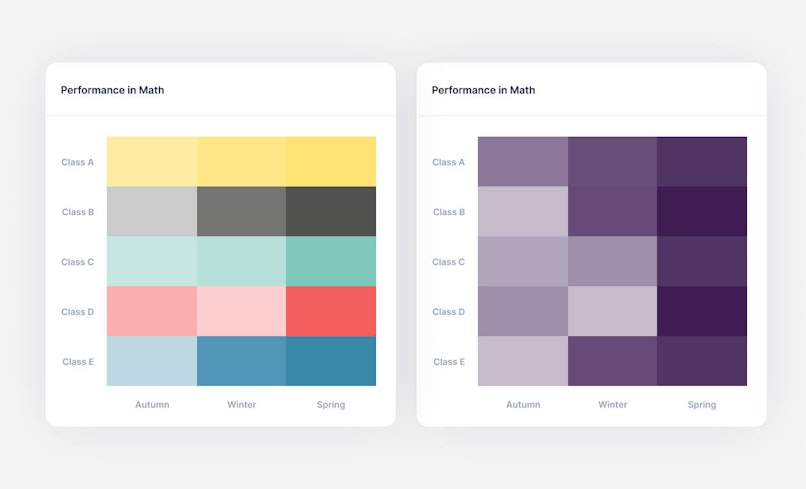 For instance, if a graph or a chart compares two groups, representing them in green and red can lead to misrepresentation. We might automatically assume that one of them is performing poorly.