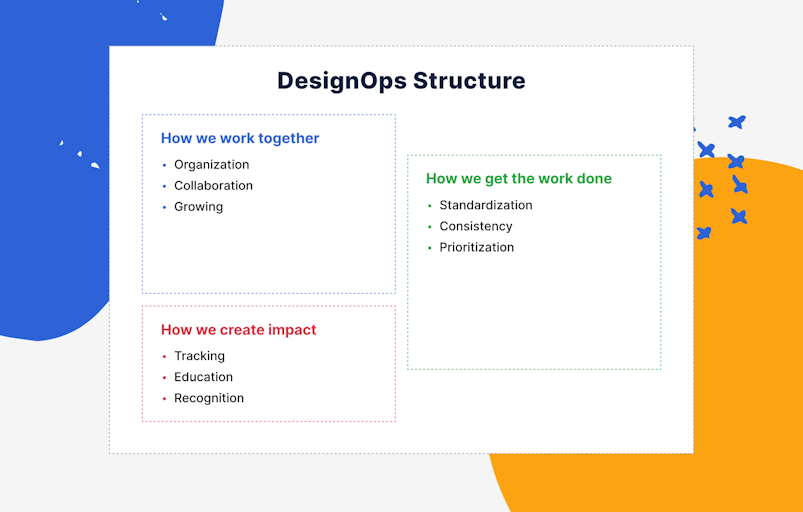 Out of the disciplines we’ve mentioned above (HR, QA, etc), DesignOps concerns itself with three key challenges that designers face, especially in larger teams. Namely, how they work together, how they get the work done, and how they create impact.