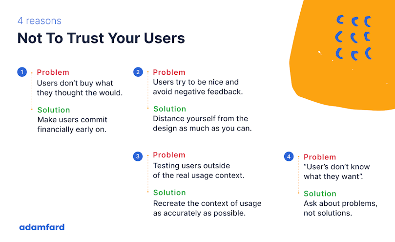 There are a plethora of pitfalls when it comes to user interviews and usability testing. While it’s fair to say that some of the inaccuracies may be caused by designers or product managers, users are people too. And as any people, they’re prone to bias.