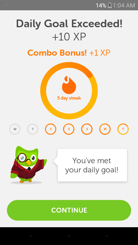Here’s an example of how Duolingo congratulates its users on achieving their daily target.