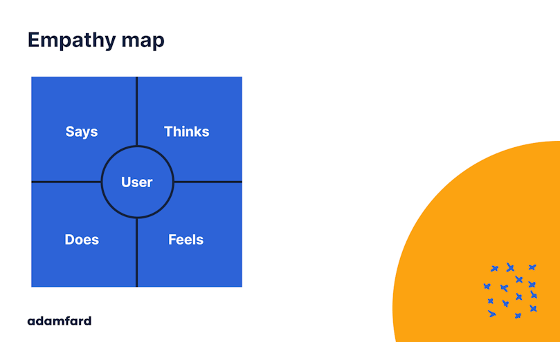 Typically, but not always, empathy maps are divided into four categories: Says, Thinks, Does, and Feels. This structure allows us to take a closer look at the user’s identity in a non-linear manner. Similarly, this approach supports the simple fact that the way we feel or think about things isn’t necessarily rational. We simply do.