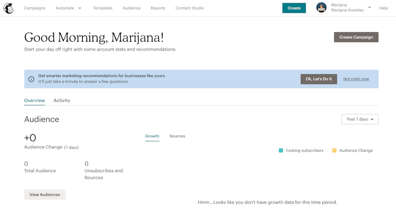 For example, Mailchimp uses a personalized message to nudge the user to take action. Their welcome page features a welcoming text where they call their users by name to attract their attention.