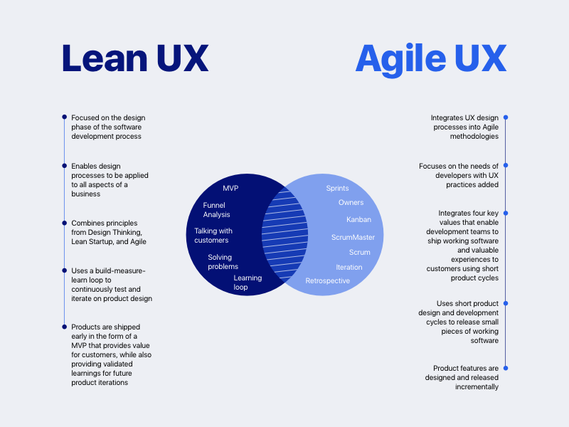 In contrast, lean UX has a shorter conception-to-deployment sequence and all the phases and their time of occurrence are not strictly dependent on one another. Specifically, they are far more iterative and flexible to order and change: