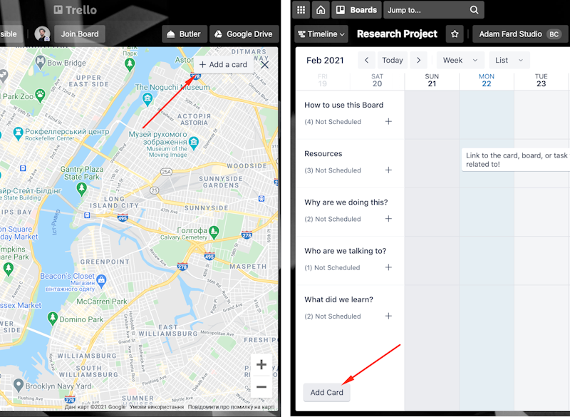 Another thing that we noticed is the inconsistent placement of the “add card” buttons. On the screenshot below, you can see the map and the timeline views side by side. Placement aside, there’s also a “+” on the left, and there’s none on the right.