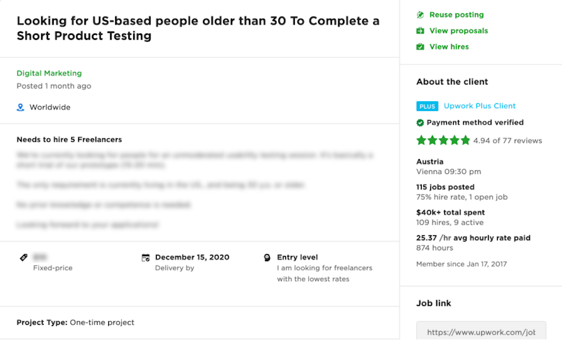 Upwork. You can create jobs for almost anything on Upwork. Consider creating a job on Upwork for a specific demographic of freelancers, e.g. “Looking for US-based single people under 30”. We, at Adam Fard Studio, use Upwork most often when it comes to looking for potential users.