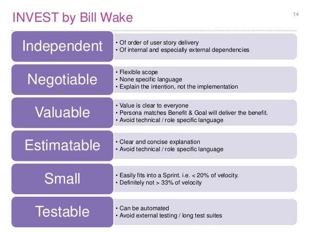 The INVEST acronym is an important set of criteria that allows us to assess the quality of a user story. If a story fails to meet one of them, it should be rewritten or reworded.