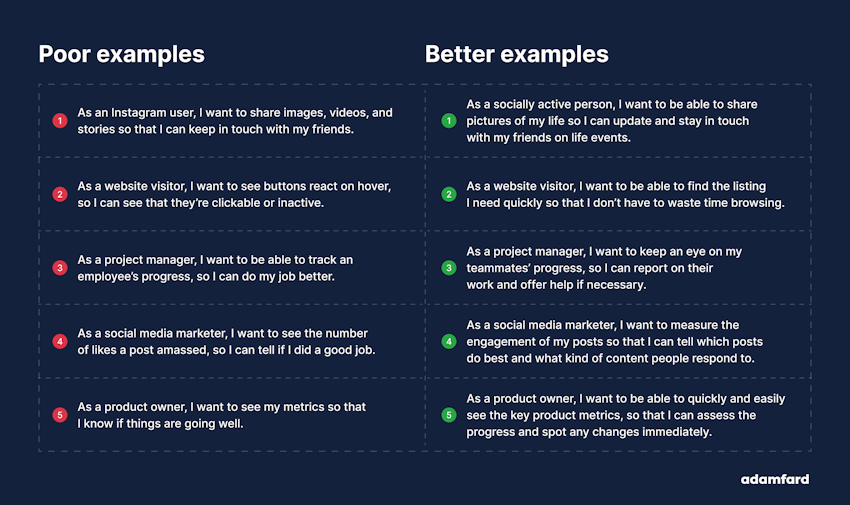Users always come first—user stories should only be about…well, users. It’s essential to underline that the people tasked with writing them should have a solid understanding of the user personas and the research done to inform them;
