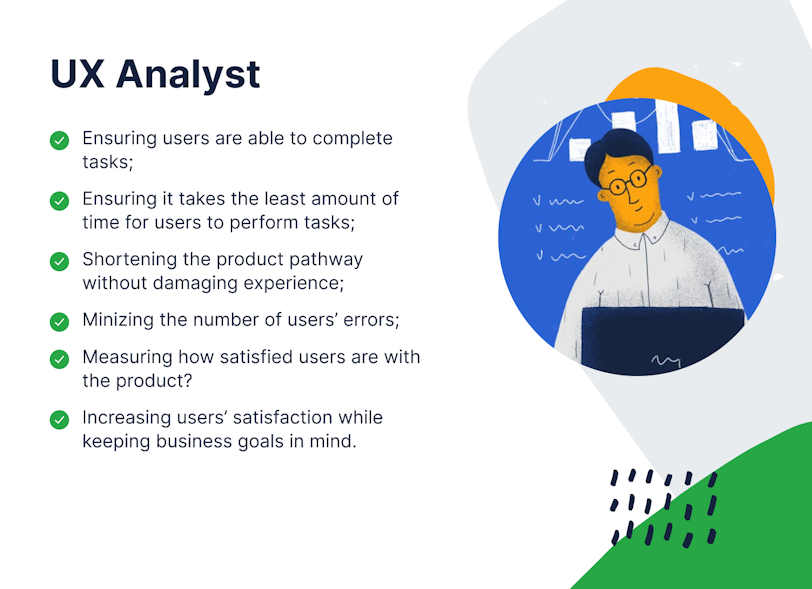 An analyst’s role is also rooted in research. Their goal is to thoroughly study the users’ needs and whether their clients’ goals align with usability standards. By studying the product’s customers, UX analysts establish the features that will help users reach their goals.