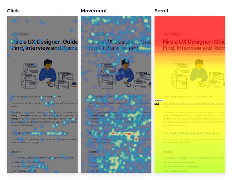 Heatmaps are an invaluable tool during a UX review. They are a visual representation of your users’ interaction with your interface.