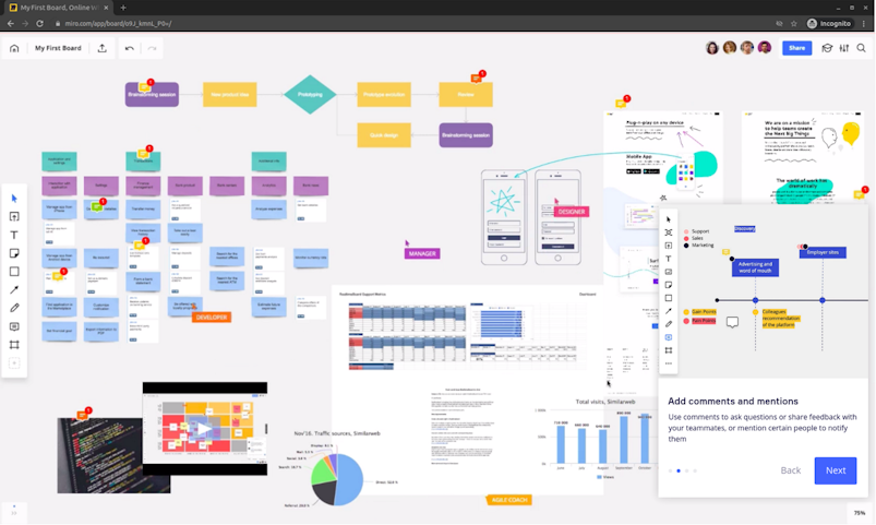 Take a look at how Miro progressively shares its functionality through useful pop-ups.