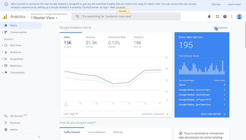 Google Analytics gives users access to a fictional merch store's data, allowing users to experiment with the service.
