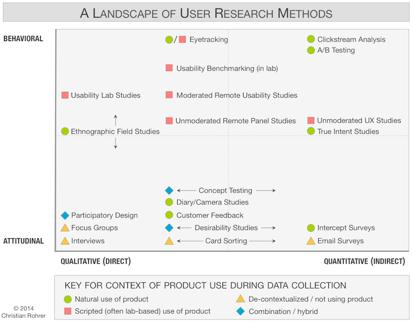 UX testing offers us a variety of tools. However, these tools don’t fall into clear-cut, mutually exclusive categories. It’s best to look at them as a 2D landscape. This method landscape has two axes: “behavioral and attitudinal methods” and “quantitative and qualitative methods.”