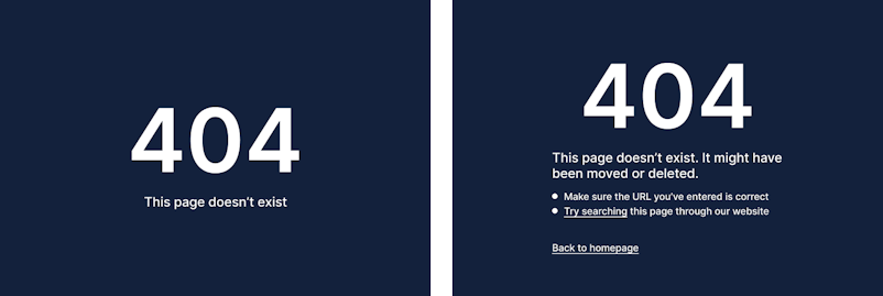 Take a look at the examples below. The first screen provides very little value, it merely states a fact. On the other hand, the second screen explains what might have happened to the page and provides users with further instructions.