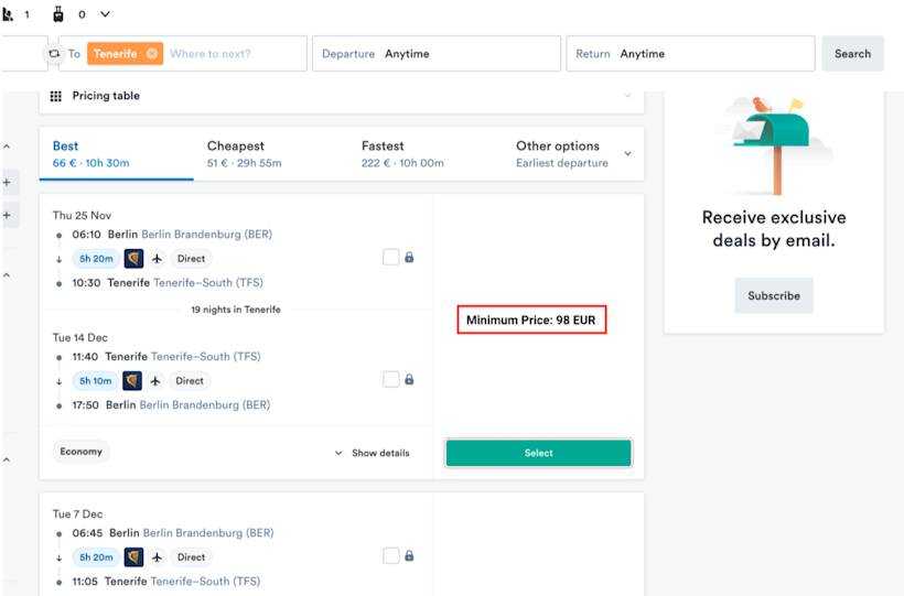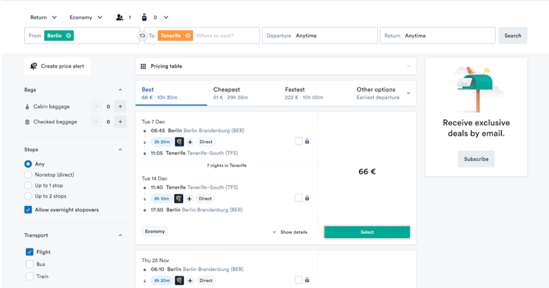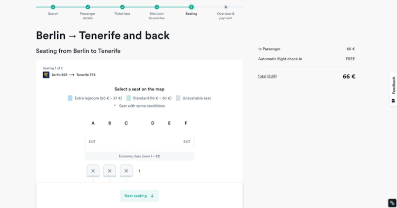 Below, you can see a screenshot from Kiwi, a website for booking flights and hotels. I’ve searched for a two-way flight from Berlin to Teneriffe. The price the website displays is 66 EUR. Sounds great, let’s click select.