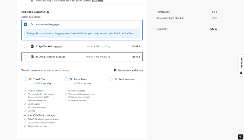 Fine, I don’t want extra luggage, insurance, priority boarding, guarantees, and the other attempts to upsell. The bare minimum will do. I expect to spend 66 EUR as the Kiwi said I would.