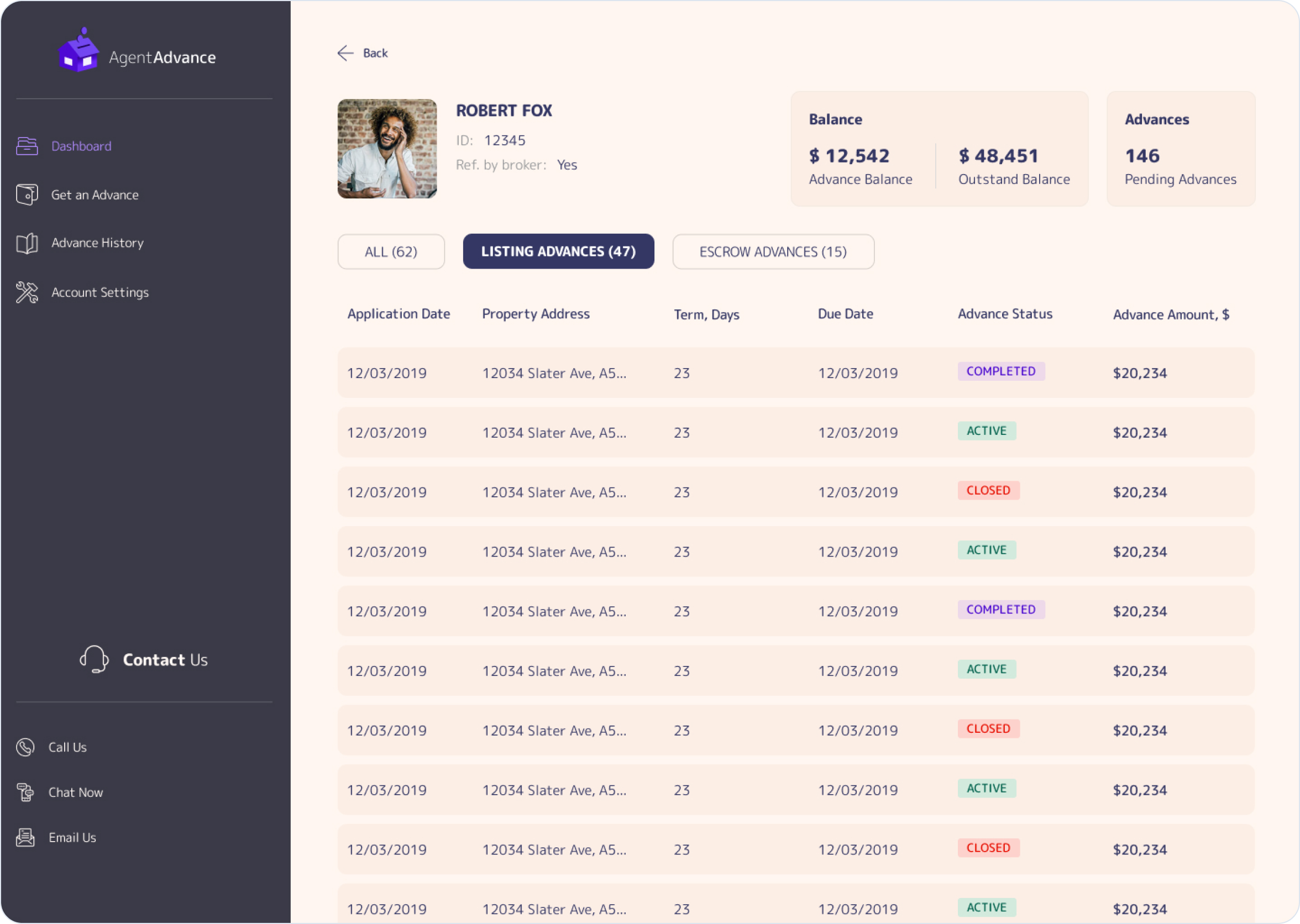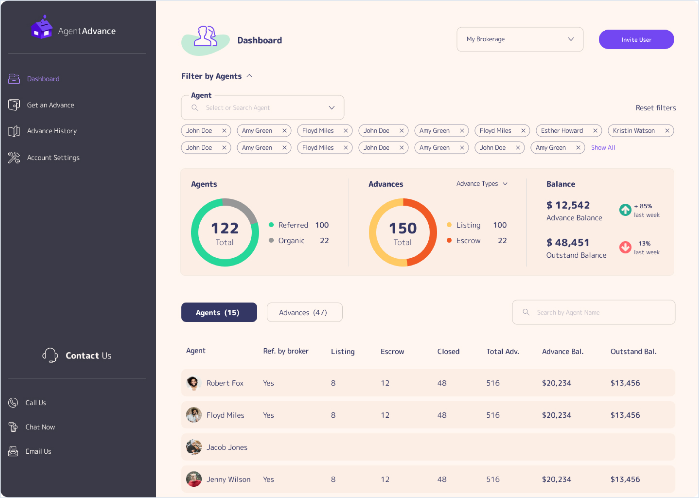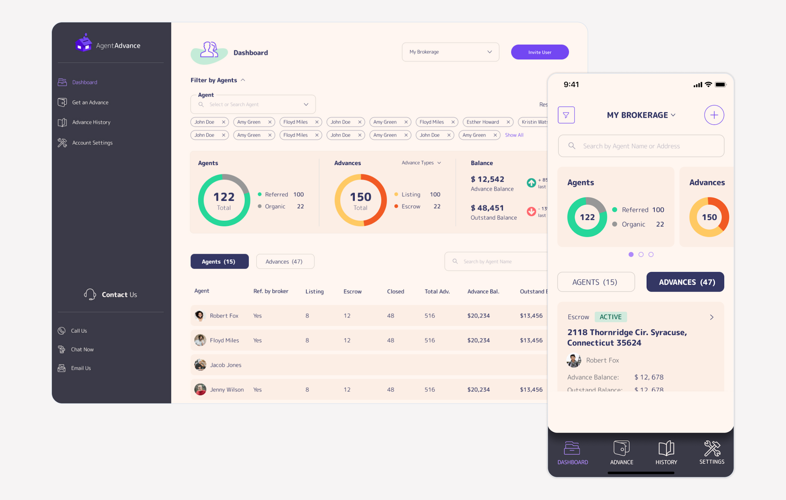 Helping brokers track their agents' progress is a vital feature to the success of Agent Advance. As such, we've put maximum effort into adequately accessing brokers' needs through user research activities. Then, we've translated the findings into the profile page you see on your left. Finally, we've validated our design decisions both internally and externally.